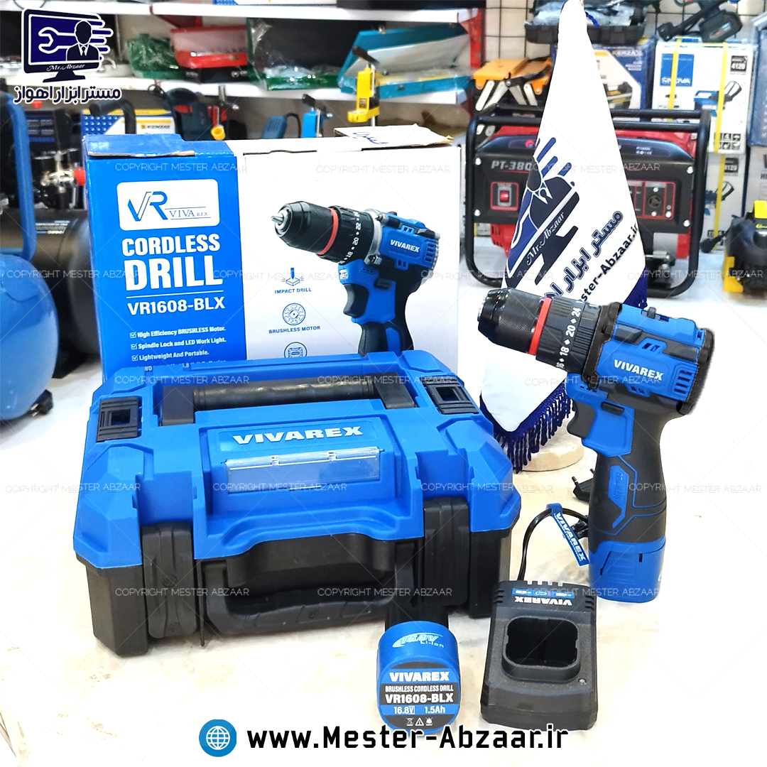 دریل پیچ گوشتی براشلس چکشی سه نظام فلزی شارژی 16.8 ولت 2 باتری ویوارکس با کیف صنعتی یک سال گارانتی مدل VIVAREX VR1608-BLX