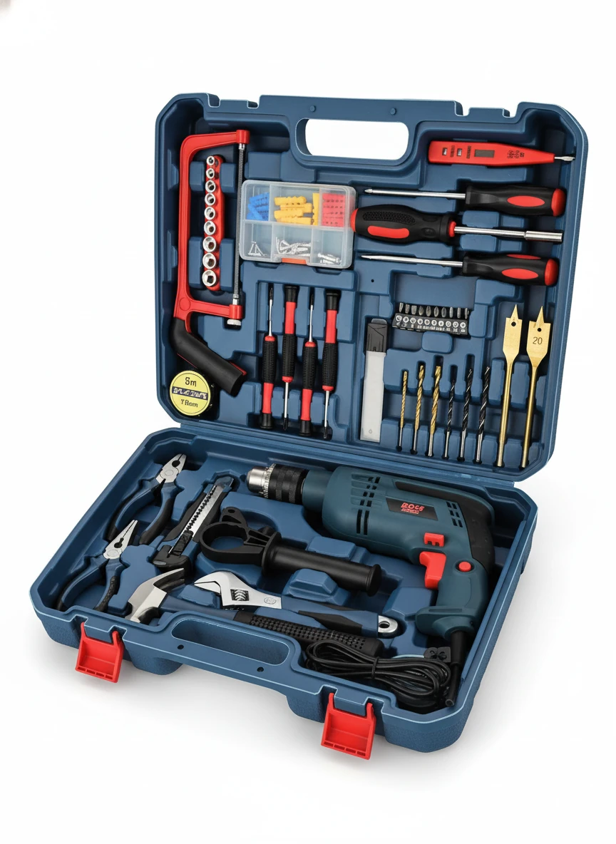 مجموعه ابزار باس BOSS : تعدادی وسیله که در کنار یکدیگر قرار می گیرند و همگی کاربرد مشخصی دارند مجموعه ابزار گفته می شود. ابزار شامل انواع آچار، پیچ گوشتی، سوهان، مته، انواع انبر، سیم چین و در این مورد بخصوص دریل و… است. این ابزار ها درون جعبه مخصوصی قرار دارند که ابزار ها در این جعبه در جای مخصوص خود بدون بهم ریختگی قرار گرفته اند که این مجموعه ابزار را تشکیل می دهد.