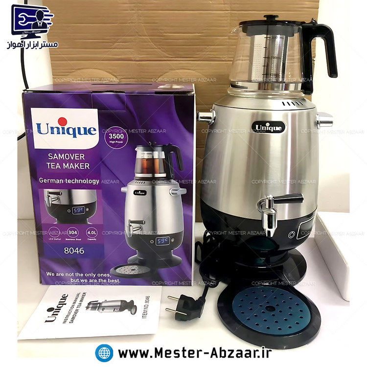 چای ساز سماور برقی 3500 وات 4 لیتری یونیک تکنولوژی آلمان مدل Unique 8046 استیل و قوری شیشهای پیرکس 1 لیتری نه تنها طعم چای را برای شما حفظ میکند، بلکه با زیبایی ظاهری و استحکام بدنه، یک عمر آشپزخانه شما را آراسته خواهد کرد. این دستگاه دارای مشخصات جذابی است که خرید آن را توجیه میکند. در ادامه به بررسی کامل این مشخصات میپردازیم.