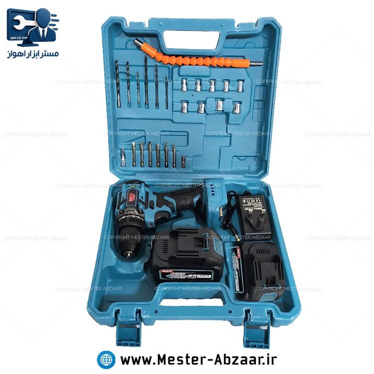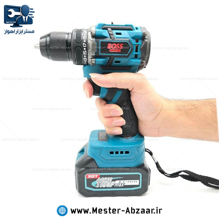 دریل شارژی براشلس طرح ماکیتا سه نظام فلزی 118 ولت دو باتری برند باس با کیف و لوازم مدل BOSS 118W XGT