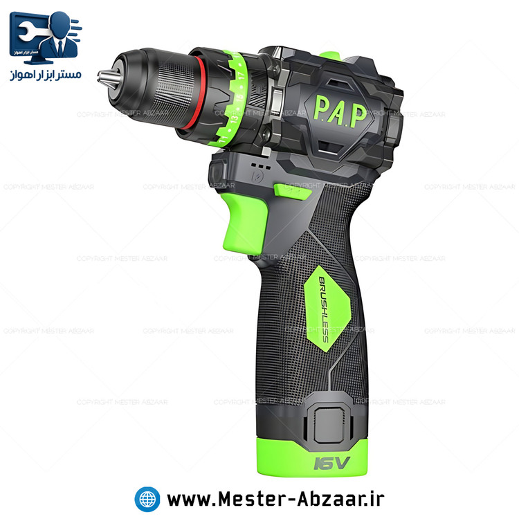 دریل پیچ گوشتی براشلس سه نظام فلزی شارژی 16 ولت 2 باتری پی ای پی با گارانتی و کیف مدل P.A.P BID-1615