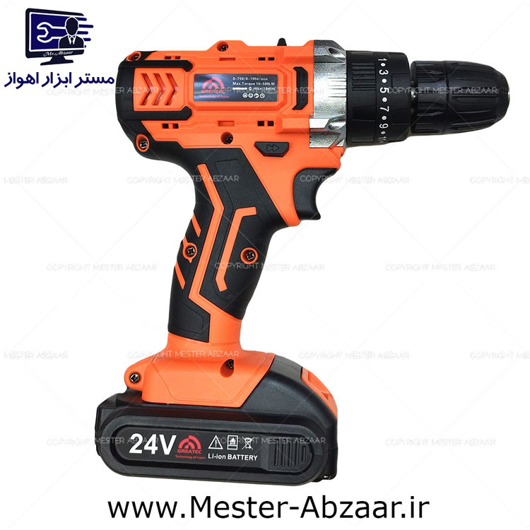 کیت کامل دریل شارژی چکشی 24 ولت گریتک با لوازم دو باتری مدل GREATEC 24V 1858 FOOL KIT