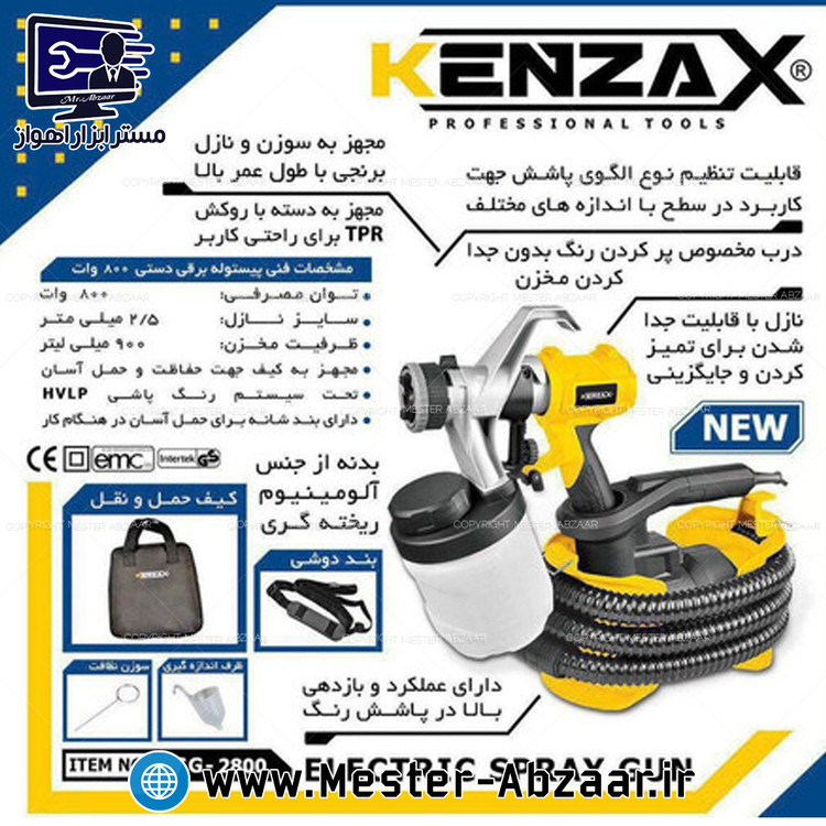 به غیر از نقاشی با قلممو و غلطک یکی از ابزاری که برای برای نقاشی سطوح و محیطهای مختلف استفاده میشود پیستوله است. پیستوله برقی کنزاکس مدل KSG-2800یکی از پیستولههای برقی است که با برند کنزاکس «KENZAX» ساخته میشود. این محصول با برق شهری کار میکند و 800 وات قدرت دارد. از سه بخش اصلی تشکیل شده که شامل موتور دستگاه و لوله خرطومی انعطاف پذیر مقاوم و دسته کنترل میباشد. لازم به ذکر است شاسی اصلی دسته کنترل پیستوله برقی کنزاکس مدل KSG-2800 از جنس آلومینیوم ریخته گری بوده که ضامن طول عمر بالای و سهولت در نظافت بدنه را برای کاربر به ارمغان می آورد برای پر کردن مخزن دستگاه نیازی به جدا کردن آن از بدنه نمیباشد و شما به راحتی با از طریق درپوش مخصوص تزریق رنگ میتوانید میزان رنگ دلخواه را در مخزن تغذیه نمایید . این محصول مجهز به اهرم تنظیم نوع الگوی پاشش جهت کاربرد در سطوح با اندازه های مختلف میباشد که موجب راحتی کاربر را فراهم می نماید . نازل محصول از جنس برنج با قطر سری 2 میلیمتر طراحی شده و میزان پاشش رنگ از آن در هر دقیقه به حدود 200 میلیلیتر میرسد و مجهز به مخزن پلاستیکی مدرج با گنجایش 900 میلیلیتر میباشد . طراحی تیم تحقیق و توسعه کنزاکس برای این کالا بگونه ای انجام شده است که لوله خرطومی آن به دور بدنه پیچیده و جمع می گردد که از آسیب به آن در کارگاه جلوگیری میشود . داخل بسته بندی علاوه بر کیف جابجایی و بند رودوشی ظرف اندازه گیری غلظت و سوزن نظافت نازل قرار دارد . کنزاکس با خرید KSG-2800 دیه ین دستگاه بهطور کامل حدود 3 کیلوگرم وزن دارد. امروزه پیستولهها از رایجترین ابزاهایی که برای رنگ کردن استفاده میشوند. این ابزار به سه صورت بادی، شارژی و برقی تولید میشوند. برای استفاد از پیستولههای بادی باید از کمپرسورهایی که میزان فشار هوای مورد نیاز پیستوله را تولید میکنند استفاده کنید. ولی پیستولههای شارژی و برقی، تنها با استفاده از انرژی برق کار میکنند. پیستوله مدل 510SG یک نمونه از پیستولههای برقی است.